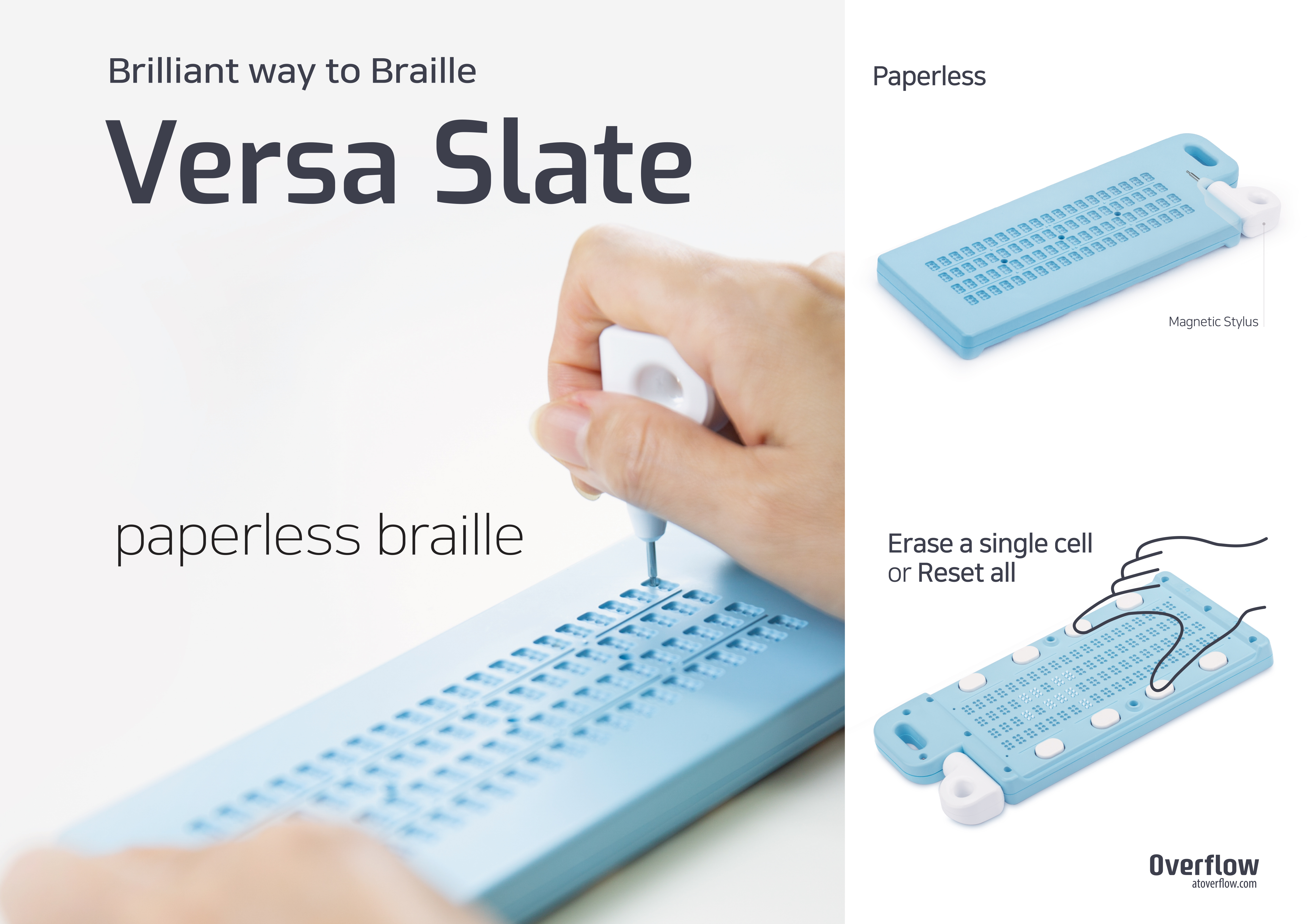 VersaSlate ist ein papierloses und löschbares, mechanisch betriebenes Braille-System. Keine elektrischen Komponenten. Dieses einheimische Gerät ermöglicht eine einfache Korrektur von Tippfehlern. Versa Slate ist tragbar und sehr langlebig, wodurch die Benutzerfreundlichkeit jederzeit gewährleistet ist. Gestochen scharfe Punkte sind leicht zu verstehen. Die Blindenschrift wird mit VersaSlate viel einfacher und schneller.